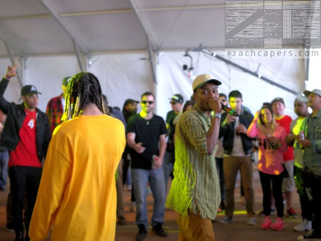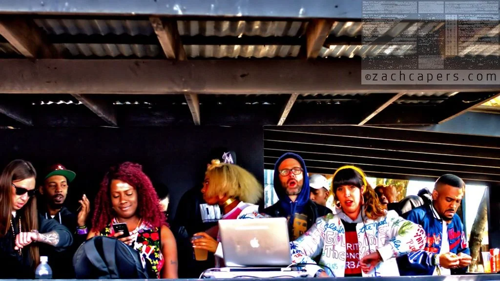 ^ Not my pic, but we were caught in the background by the Fader photographer who was getting a shot of the guy with the shoes around his neck. The artist on stage at the time, Rob $tone, had just tossed out an autographed pair of Converse tied together by the laces. When the shoes hit the ground, this guy and the guy to his left (your right, with the cup and flat brim hat) each grabbed a shoe and started tugging back and forth in what came very close to getting ugly before the one dude let go just seconds before this shot was taken.
